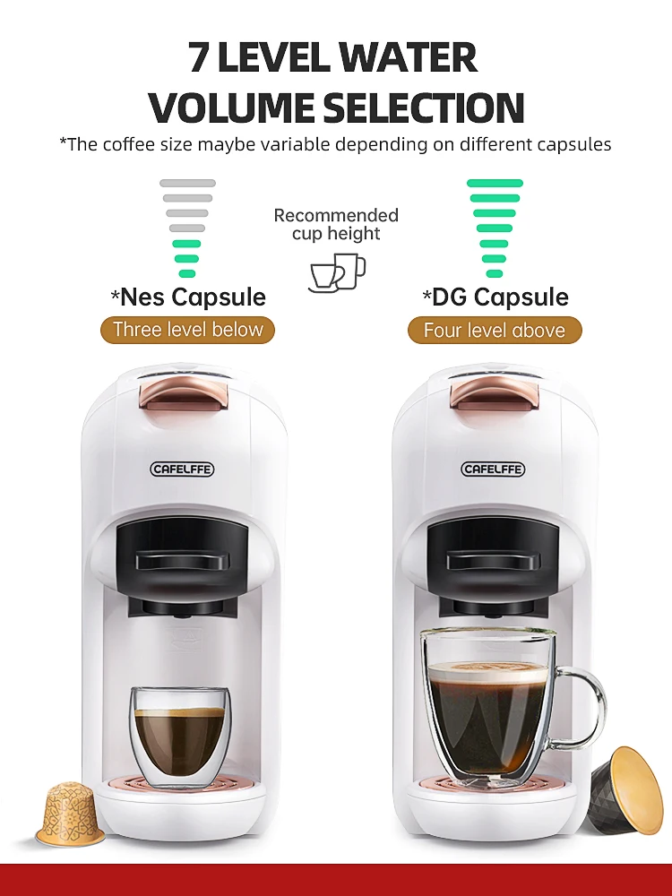 The Cafelffe 5-in-1 is the perfect coffee maker . Thanks to its compatibility with many types of capsules and ground coffee, this machine provides you with the flexibility to prepare your favorite drink easily and quickly. A unique experience for coffee loverscompatibility: compatible with Dolce Gusto capsules, Nespresso, ESE capsules, coffee grounds, and K-cup capsules.Pressure: a 19-bar pump to extract a rich, creamy and flavorful coffee.Preparation: double hot/cold mode to prepare your favorite drink at any time.Color: white.Plug type: EU.Capacity: less than 5 cups.